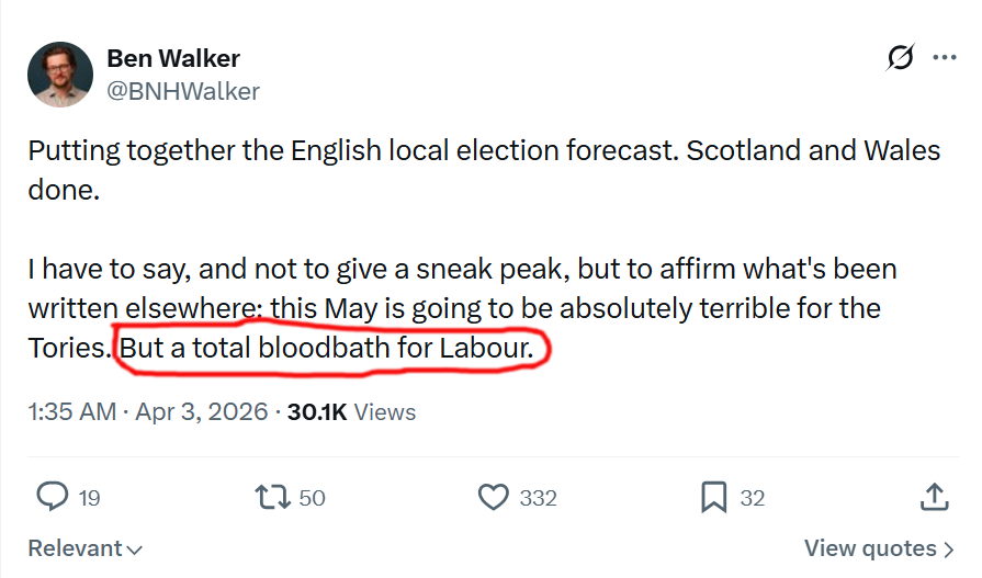 Ben Walker is a respected pollster who came closest to predicting the last General Election result. He writes for the New Statesman and is founder of the Britain Elects aggregation site. He’s also a Labour Councillor in not so far off, Chester. I have a lot of time for Ben.
