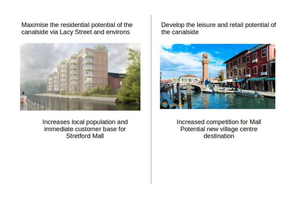 We have to lift Stretford’s town centre. I don’t think there’s a risk free solution out there but we are going to have to take some decisions. We really can’t guarantee either approach. Whilst a Stretford version of Venice is enticing, are we really capable of delivering such a destination here on the towpath of the Bridgewater canal?